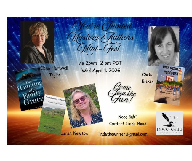 The event will take place on zoom beginning at 2 pm (PDT). INWG members and regular visitors will automatically receive the link by noon, but new folks are always welcome and, as always, there is no charge to attend. Request your link from lindathewriter@gmail.com. The more the merrier!